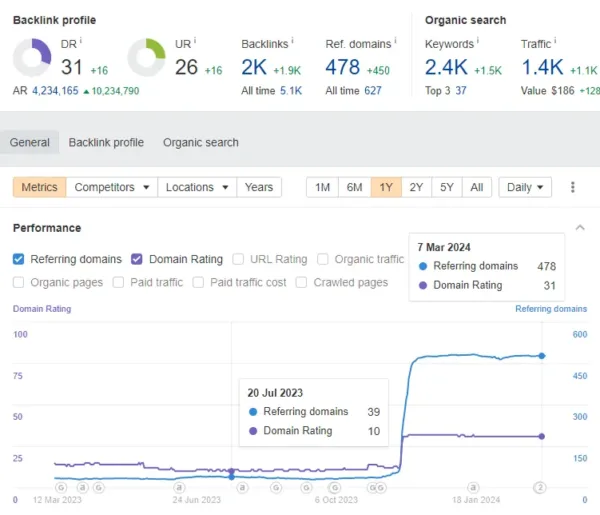 ドメインレーティング(DR)と参照ドメインの数が増加。